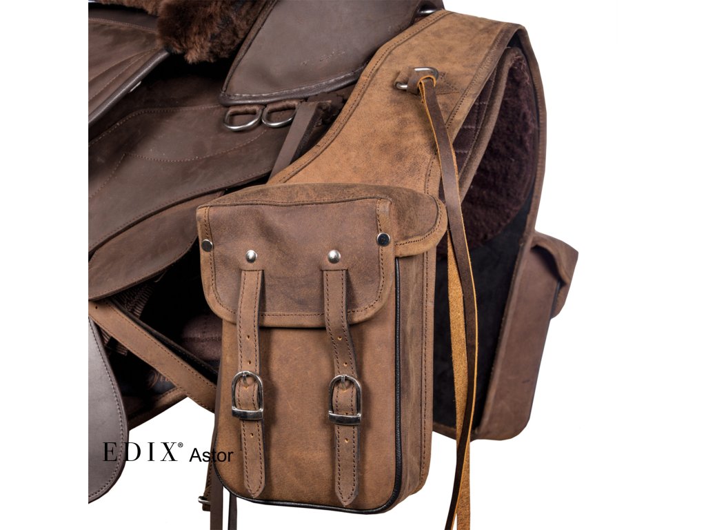 Brašny EDIX® Astor se připevňují koženými řemínky k D-kroužkům. Lze použít i na kostrová sedla.