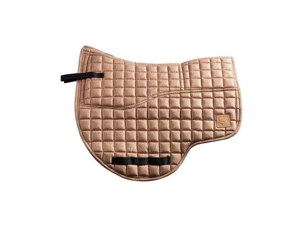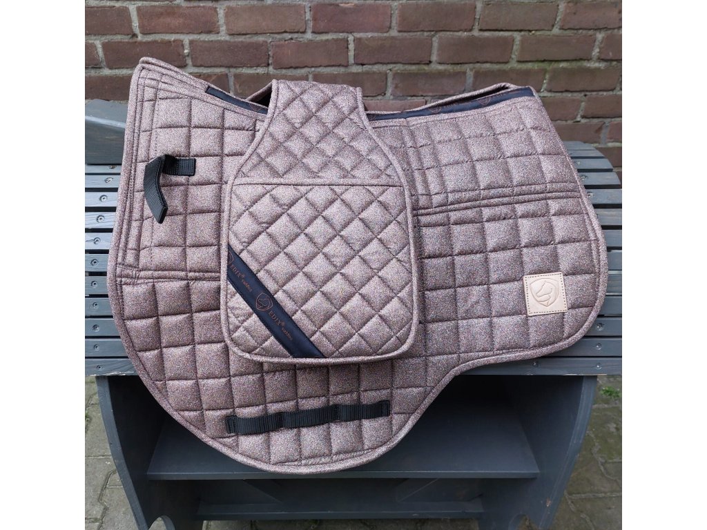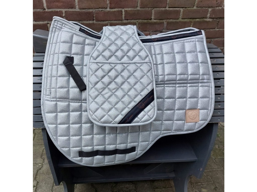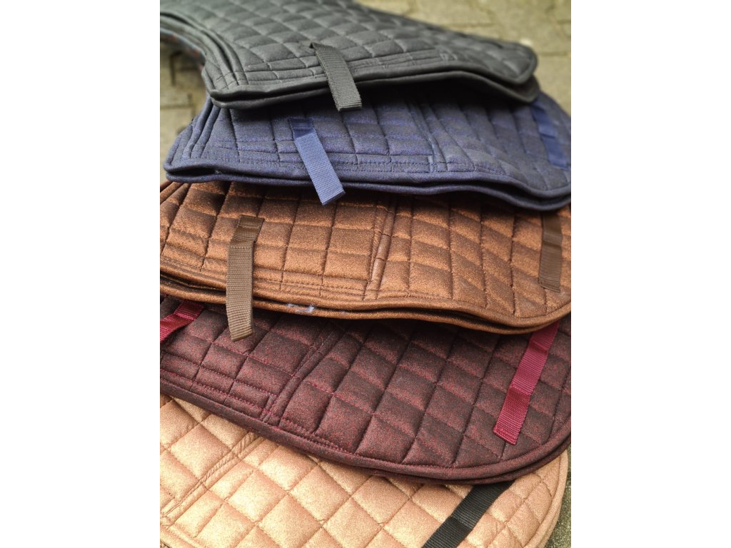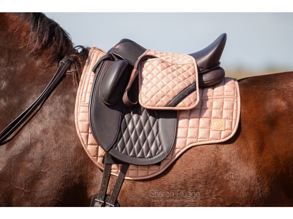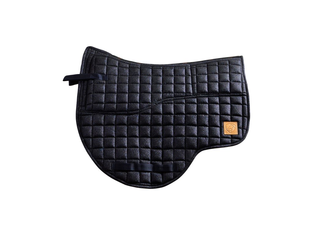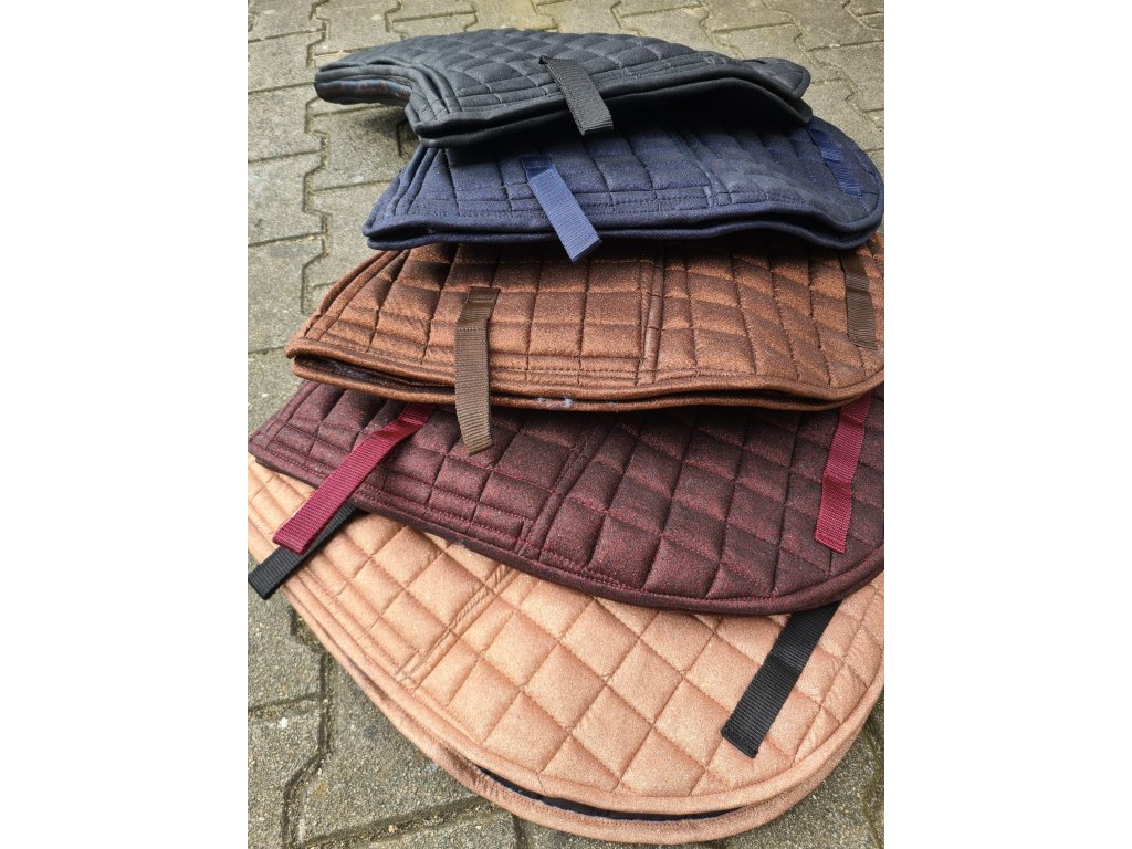 Speciální korekční dečka s kapsami v třpytivém vzhledu. Tato podložka má velkou přihrádku a 3 malé přihrádky na vložky na obou stranách páteře, všechny s plstěnými vložkami. V případě potřeby lze samozřejmě zvolit jiný typ vložky. Protože má podložka 8 kapes na vložky, existuje několik možností, jak zajistit další rozložení tlaku pomocí podložky a/nebo umístit sedlo do vyvážené polohy na koni. U sedla typu strom můžete s touto podložkou provést dočasnou korekci polohy.