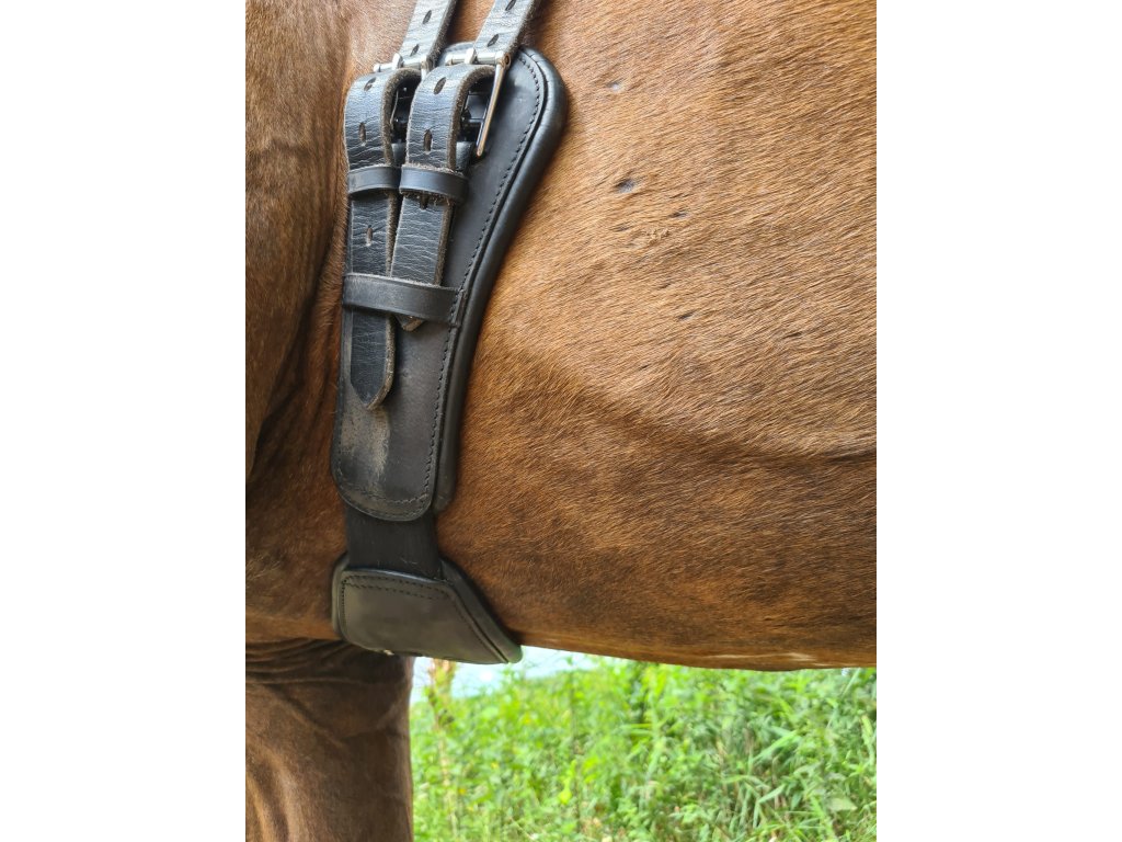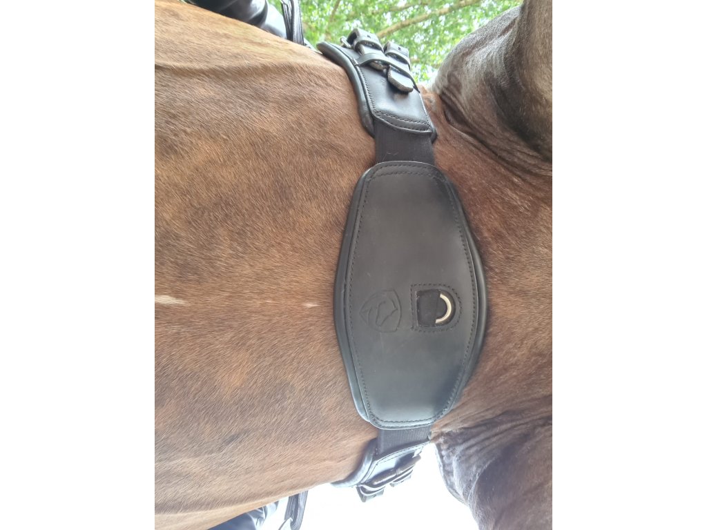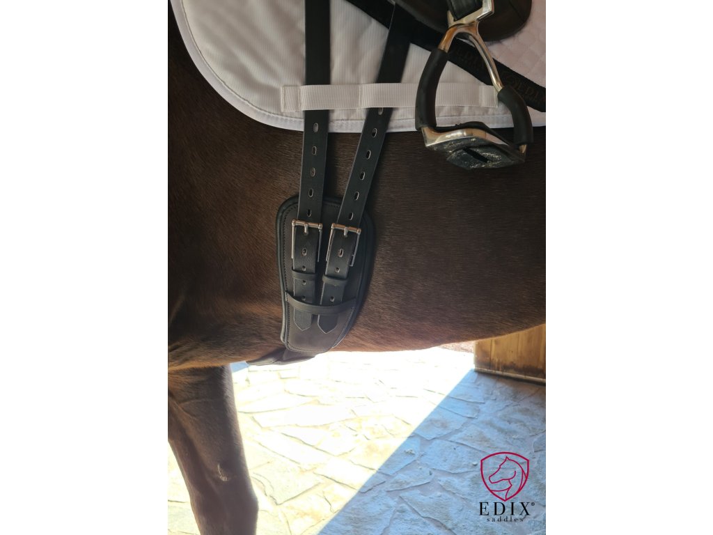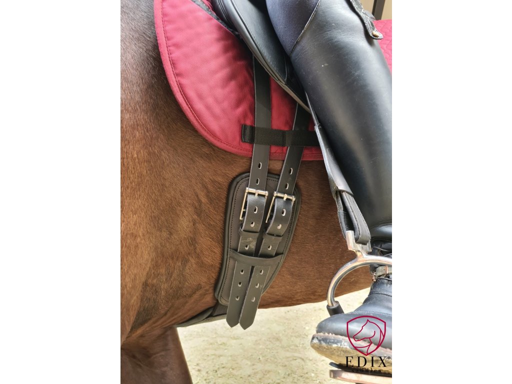 Tyto podbřišníky jsou často ideální pro koně s krátkým hřbetem, širokým hrudním košem a/nebo úzkým hrudníkem. Specifický tvar podbřišníku poskytuje prostor pro pohyb lokte, což zajišťuje dostatečnou volnost pohybu koně. 3 kožené díly jsou anatomické, mají velmi měkké polstrování a nabízejí velkou kontaktní plochu, což zajišťuje příjemné rozložení tlaku. Tyto široké kožené díly jsou spojeny trojitou gumou, která zajišťuje stálou pevnou fixaci a zároveň vysoké pohodlí pro vašeho koně. Odolná guma s elasticitou přizpůsobenou síle vašeho koně chrání sedlo před nežádoucími silami způsobenými proměnlivým obvodem břicha vašeho koně během jízdy. Guma podbřišníku se během pohybu koně trvale nastavuje na délku, což umožňuje koni správně dýchat a správně používat břicho, přičemž sedlo drží na místě s neustálým napětím. To zaručuje pohodlí pro vašeho koně!