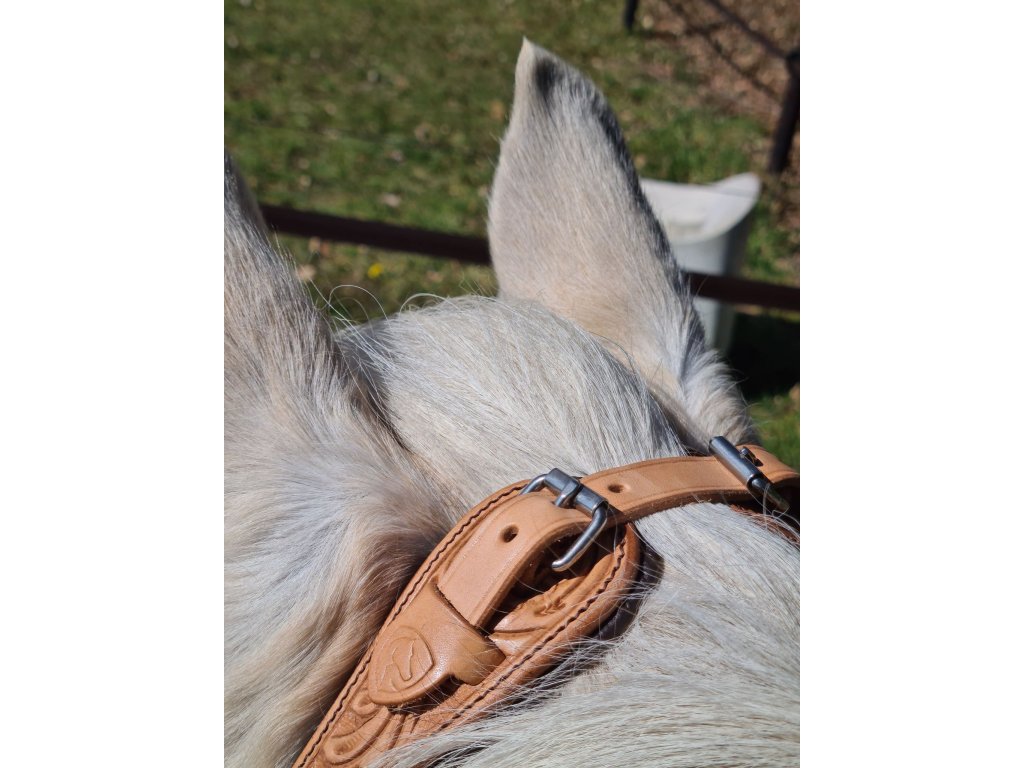 Design zaměřený na pohodlí: Speciální čelenka zajišťuje, že uši zůstanou bez tlaku, a pojistka na krku je navržena tak, aby lícní části nedotýkaly očí. Čelenka i nánosník jsou měkce polstrované a oválného tvaru, aby poskytovaly optimální pohodlí. Čelenka je plně nastavitelná, což umožňuje přizpůsobit uzdu každému jednotlivému koni. Díky unikátně navržené čelence, pojistce na krku a lícním částem uzda bezpečně sedí na hlavě koně.