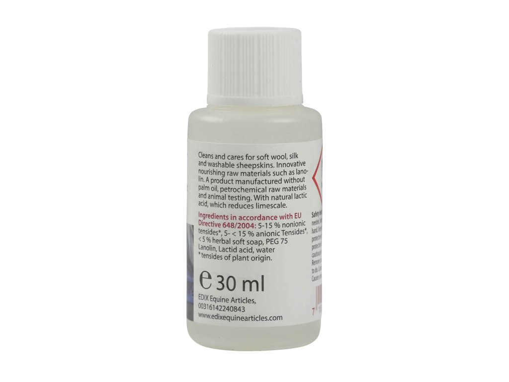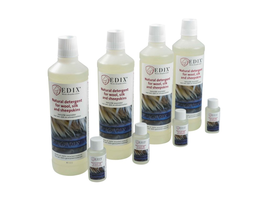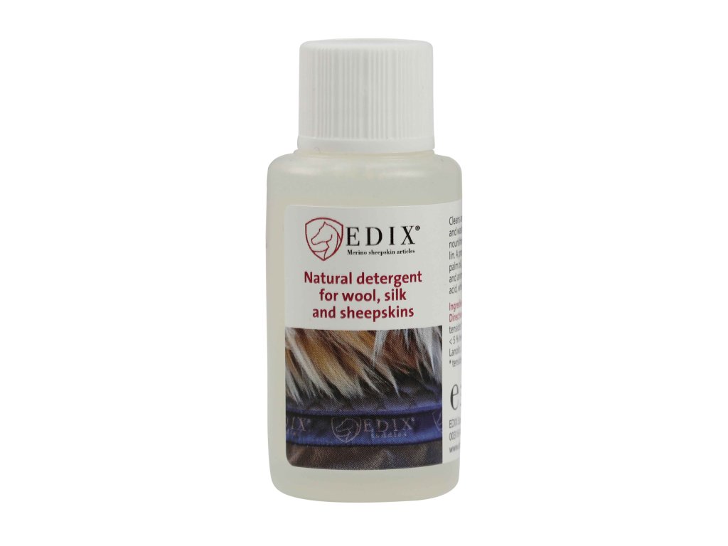 Váš výrobek z ovčí kůže je přirozeně obohacen o lanolin, přírodní tuk z ovčí kůže. Tento tuk zajišťuje, že váš výrobek z ovčí kůže vydrží roky při jednoduché a pravidelné údržbě. Mějte na paměti, že všechny čisticí prostředky tento tuk z kůže a vlněných vláken odstraňují. Proto je naprosto nezbytné používat speciální prací prostředek na kůži a vlnu z ovčí kůže. Jakýkoli jednoduchý prací prostředek na vlnu výrobek nenapravitelně poškodí tím, že z něj tento tuk odstraní. Správný prací prostředek vaši ovčí kůži vypere a zároveň ji vyživí nezbytným tukem. Společnost EDIX® vyrobila v Německu vlastní prací prostředek na kůži a vlnu, vyrobený ze 100% přírodních ingrediencí, dostupný v recyklovatelných lahvích o objemu 500 ml, který má potřebné regenerační vlastnosti. Prací prostředek EDIX® sheepskin je ekologický prací prostředek na vlnu a kůži s lanolinem a je vhodný pro všechny druhy vlny, hedvábí a pratelné ovčí kůže. Díky přidanému lanolinu je prací prostředek trochu mastný, ale tato složka zajišťuje, že kromě udržení vašeho ovčího oděvu zůstávají vlněná vlákna odolná vůči vodě a nečistotám.