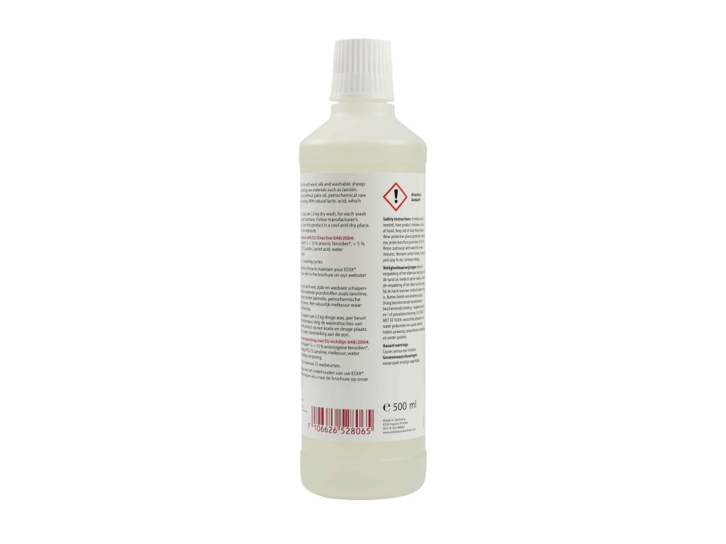 Prací prostředek EDIX sheepskin obsahuje aviváž pro všechny teploty a vodní vlákna. Skládá se ze složek, jako je kokosový olej, rostlinné mazací mýdlo a pravotočivá kyselina mléčná, které zabraňují usazování vodního kamene a neutralizují hodnotu pH. Díky tomu je produkt velmi šetrný k pokožce a vhodný i pro vegany.