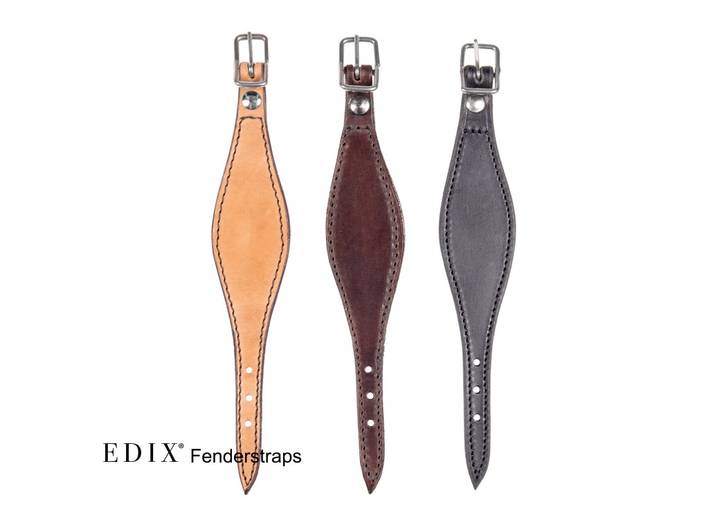 Kožené popruhy na fendry s přezkou z nerezové oceli. Dodávány v páru.