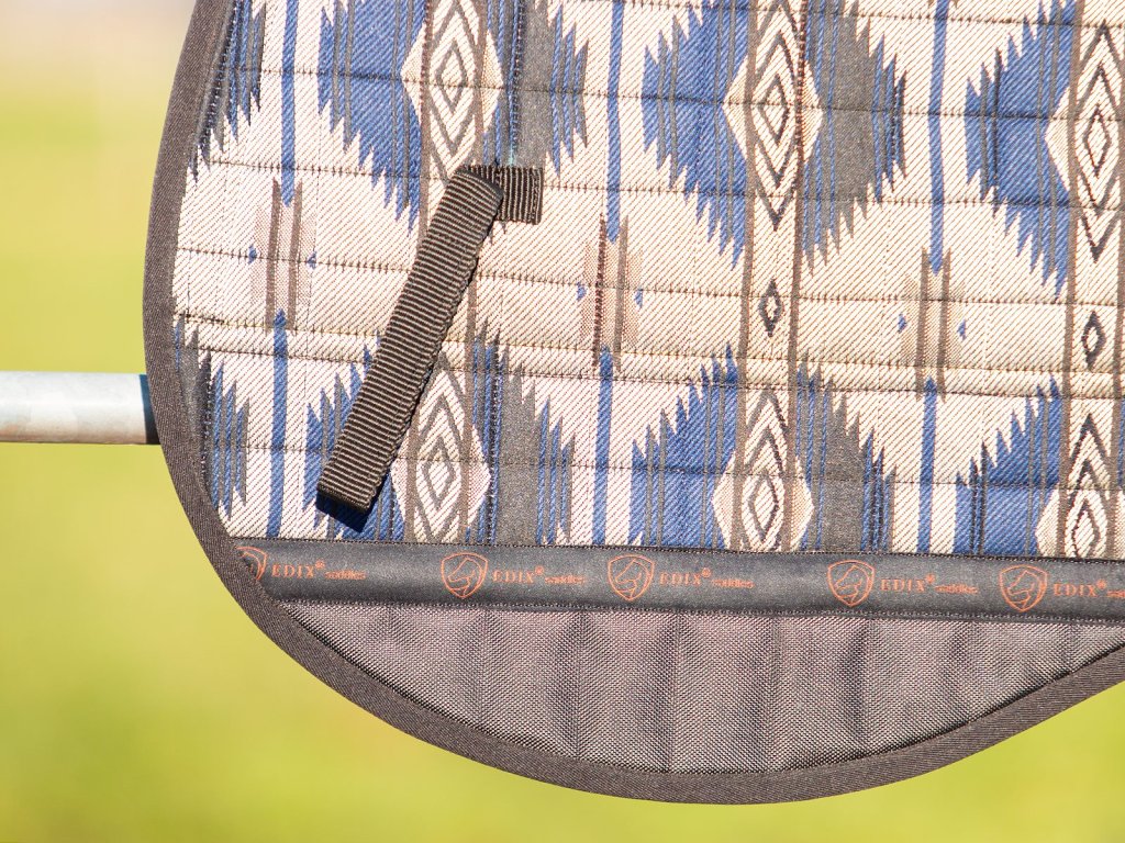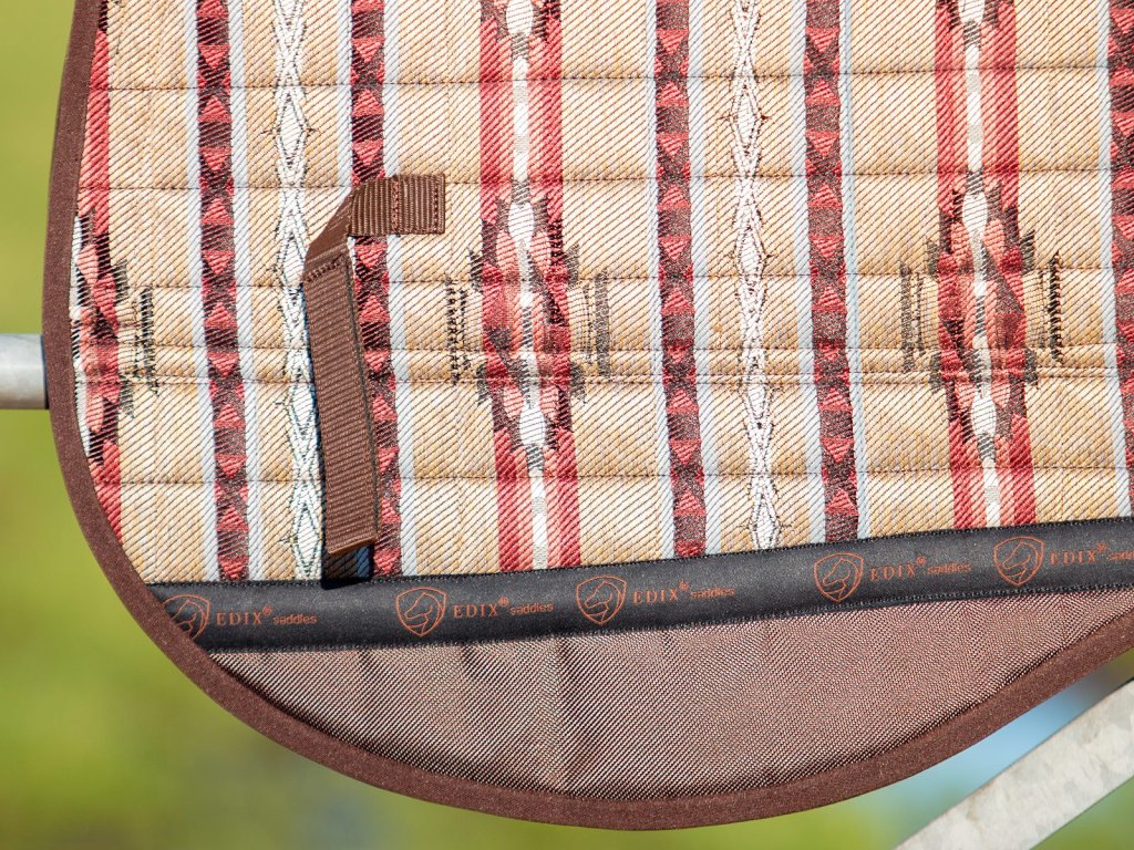Tato podsedlová dečka EDIX Western je vyrobena z pevné bavlněné vnější tkaniny a má 10mm syntetické plstěné jádro. Po celé délce podložky jsou 2 velké kapsy na vložky a 2 x 3 malé kapsy na vložky v horní části podložky po obou stranách středové osy. Vybavením velkých kapes na vložky je dále optimalizováno rozložení tlaku v sedle a pomocí horních kapes můžete dále optimalizovat polohu sedla. Plstěné vložky jsou standardně dodávány pro všechny přihrádky na vložky, ale volitelně si můžete objednat i další vložky. Typ vložek závisí na stavbě koně, typu sedla a/nebo hmotnosti jezdce. Vložky podléhají opotřebení a jejich schopnost rozložit tlak by měla být čas od času kontrolována. Spodní část horní části podložky, kde se noha jezdce při jízdě tře, má nylonovou výztuhu, která zabraňuje opotřebení.