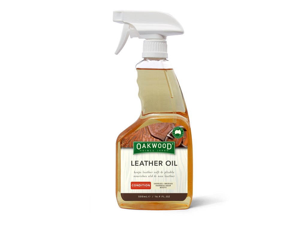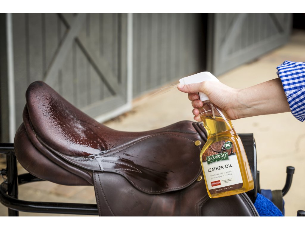 Před olejováním očistěte povrch kůže čističem Oakwood Leather Cleaner. Naneste olej na „hrubou“ neboli masitou stranu kůže a buďte opatrní při nanášení přípravku na podbřišníky nebo třmeny. Nadměrné olejování může tyto části oslabit.