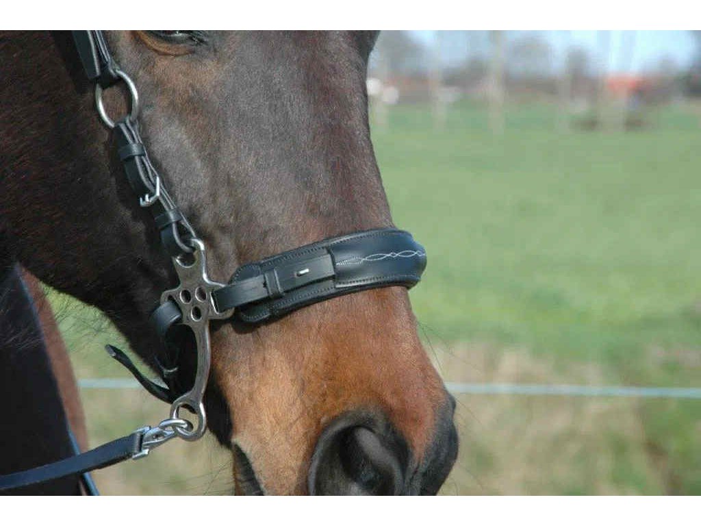 F.R.A.® Aram - Kompletní kožená uzdečka hackamore bez otěží s rameny hackamore F.R.A., snadno nastavitelná pomocí pružinové spony, nánosník s ozdobným prošíváním a polstrováním v oblasti nosu a krku. Volitelně k dispozici s jakýmkoli jiným typem ramen hackamore F.R.A.