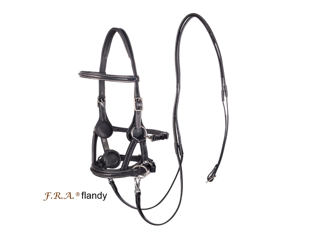 F.R.A.® Flandy je bezudidlová uzdečka s funkcí sidepull. Má speciální kruhové polstrování u oček, které zajišťuje, že vašeho koně nebudou kroužky tlačit. Má ozdobné prošívání na námořníku a čelence. Dodává se včetně protiskluzových otěží.