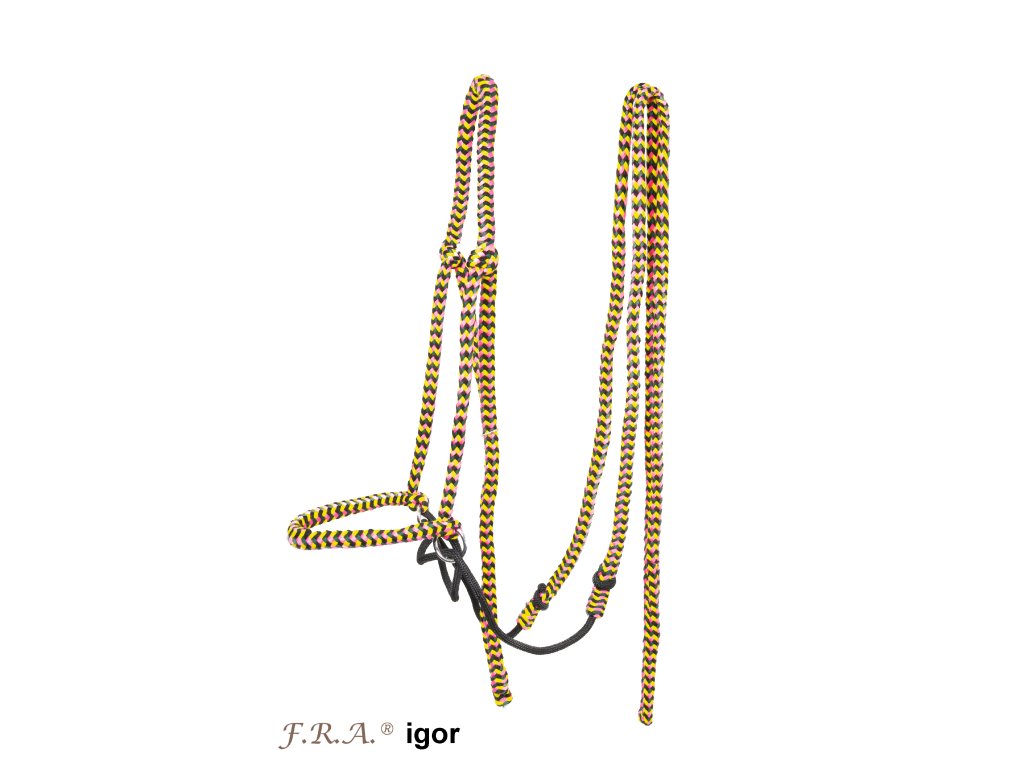 F.R.A.® Igor je nastavitelná uzda vyrobena z polybavlny 12 mm, bez čelenky a s chincross funkcí, dodávána s otěžemi bez udidla.