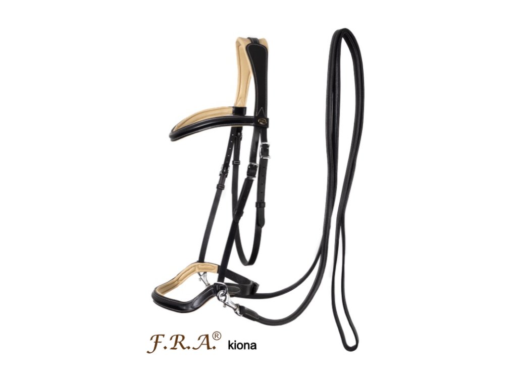 F.R.A.® Kiona je bezudidlová uzdička fungující na principu bočního tahu. Vyvinuto s ohledem na blaho koní. F.R.A. Kiona kombinuje elegantní vzhled s anatomicky tvarovaným designem, který dokonale odpovídá přirozenému tvaru hlavy koně. Čelenka a nánosník jsou vyrobeny z měkkého polstrování v krémové barvě, což zajišťuje jemné rozložení tlaku a dodává uzdě elegantní vzhled. Měkké kožené otěže doplňují tuto uzdu, vyrobenou z vysoce kvalitních materiálů.