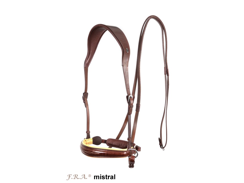 F.R.A.® Alizée mistral se nachází se v nejvyšším segmentu kolekce F.R.A.®. Je vyrobena z vysoce kvalitní anglické kůže. Veškeré polstrování je vyrobeno z 4 mm silné pěny (SPF), díky čemuž je polstrování super měkké. Nátylníkje anatomicky tvarovaný s polstrováním SPF, nánosník s ozdobným prošíváním, podbradní řemínek s polstrováním SPF a otěže jsou z anglické kůže 15 mm s protiskluzovým gumovým provedením. SPF (= super měkká polstrovaná úprava)