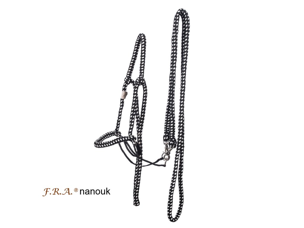 F.R.A.® Nanouk je provazová uzdečka vyrobena z polybavlny s šířkou 12 mm, bez čelenky s křížovými popruhy ze šňůrky, dodávána s otěžemi s klipem.