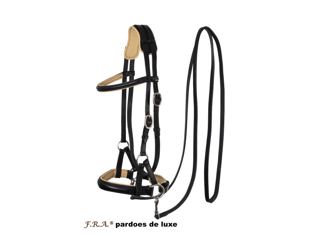 F.R.A.® Pardoes de Luxe je luxusní bezudidlová uzdečka fungující na principu bočního tahu s koženými otěžemi v ceně. Má Barevné polstrování na nose a čelence.