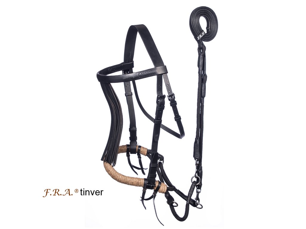 F.R.A.® Tinver je uzda s krásným španělsky zdobeným nánosníkem, speciálně vyvinutá pro velké koně. Nánosník je opletený sisalovou šňůrou, křížové popruhy jsou vyrobeny z měkkého opleteného polypropylenu. Otěže z měkké kožené šňůry s klipy jsou součástí dodávky.