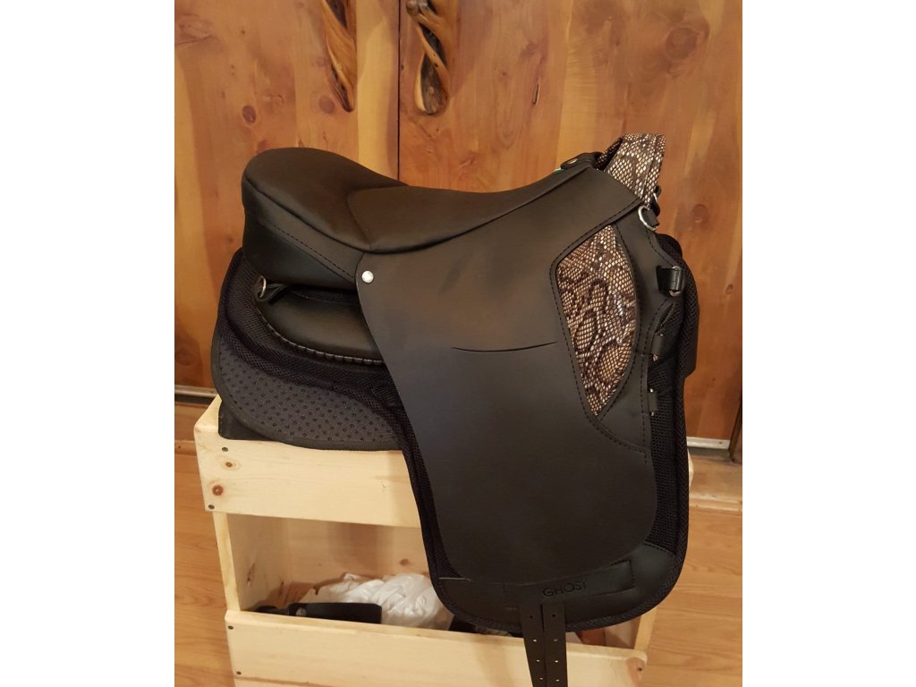 Sedlo Ghost Roma je excelentní volba pro drezurní a endurační jezdce, kteří chtějí co nejlehčí sedlo a delší třmeny. K sedlu lze libovolně připojit standardní třmenové řemeny, které lze nastavit do dvou pozic. Učitě oceníte váhu sedla, která dosahuje sotva 4 kilogramy.