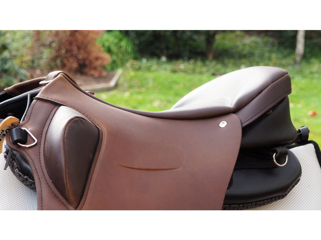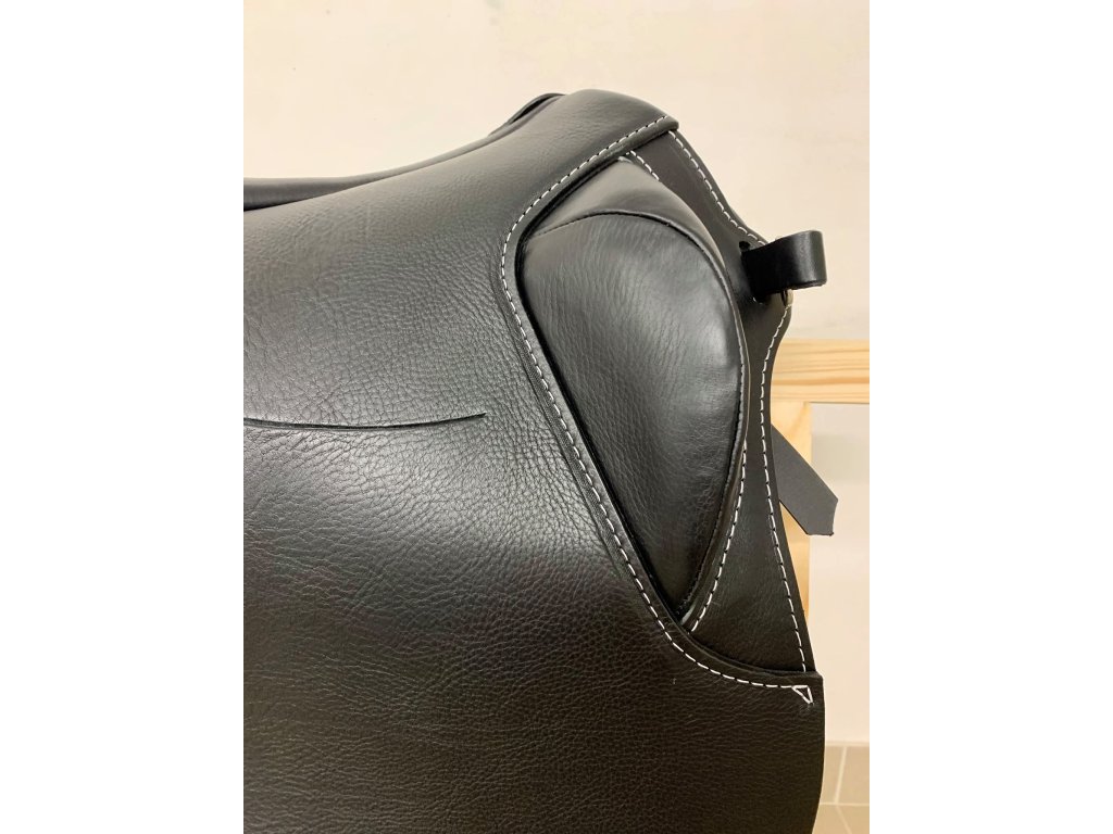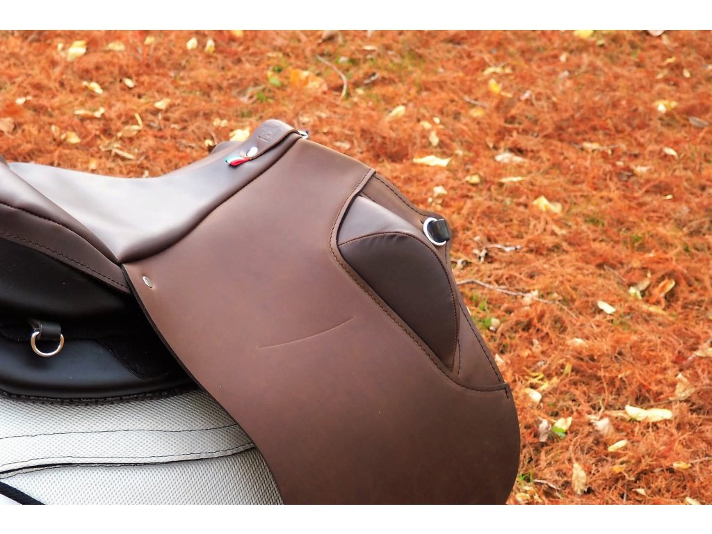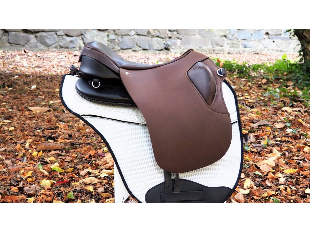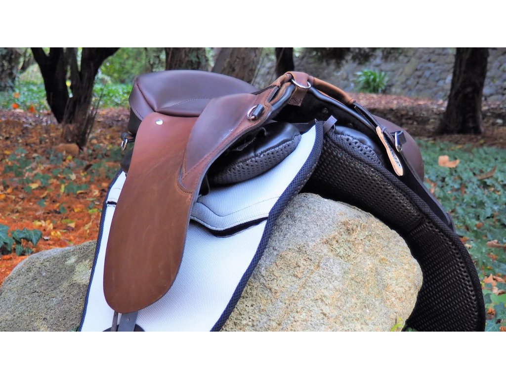 Sedlo je tvořeno ze dvou částí - ze základu (tzv. base) a z posedlí. Posedlí je uživatelsky vyměnitelné za jiné ve stejné velikosti. Když Vás jeden model omrzí, můžete si vyměnit pouze posedlí a získáte za nižší cenu naprosto jiný model. Posedlí je možné zvolit i dvojbarevné, nebo jen z pravého beránka, popusťe uzdu své fantazii. Barevné možnosti a typy kůže naleznete zde. Zespodu je tzv. panelový systém (podobně jako u Hidalgo sedel).Panely jsou tvořeny z měkkého sympatexu (je možné zvolit i beránkové) a mají otevíratelné kapsy s výplněmi.