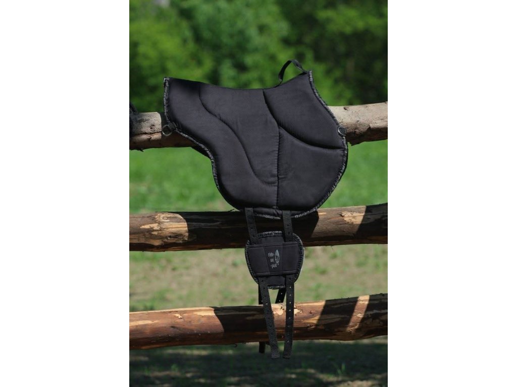 Většina jezdeckých padů je pro koně spíše škodlivá a způsobuje spíše nepohodlí než pohodlí, protože podbřišník vede přímo přes hřbet a rozkládá veškerý tlak na jeden, možná dva trnové výběžky. Pad Barefoot® 'Ride-On-Pad' má podbřišník ve tvaru V, který rozkládá tlak po celé podložce. Záměrně jsme se rozhodli nepoužívat třmenové upevnění, protože stání ve třmenech by vedlo ke vzniku tlakových bodů.