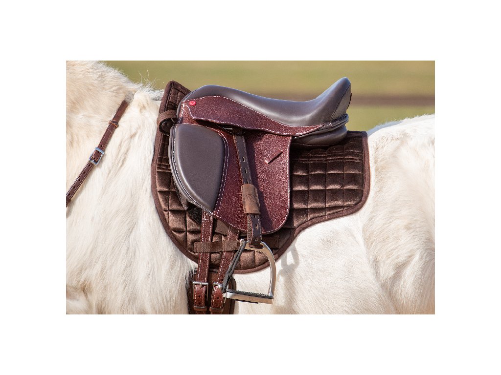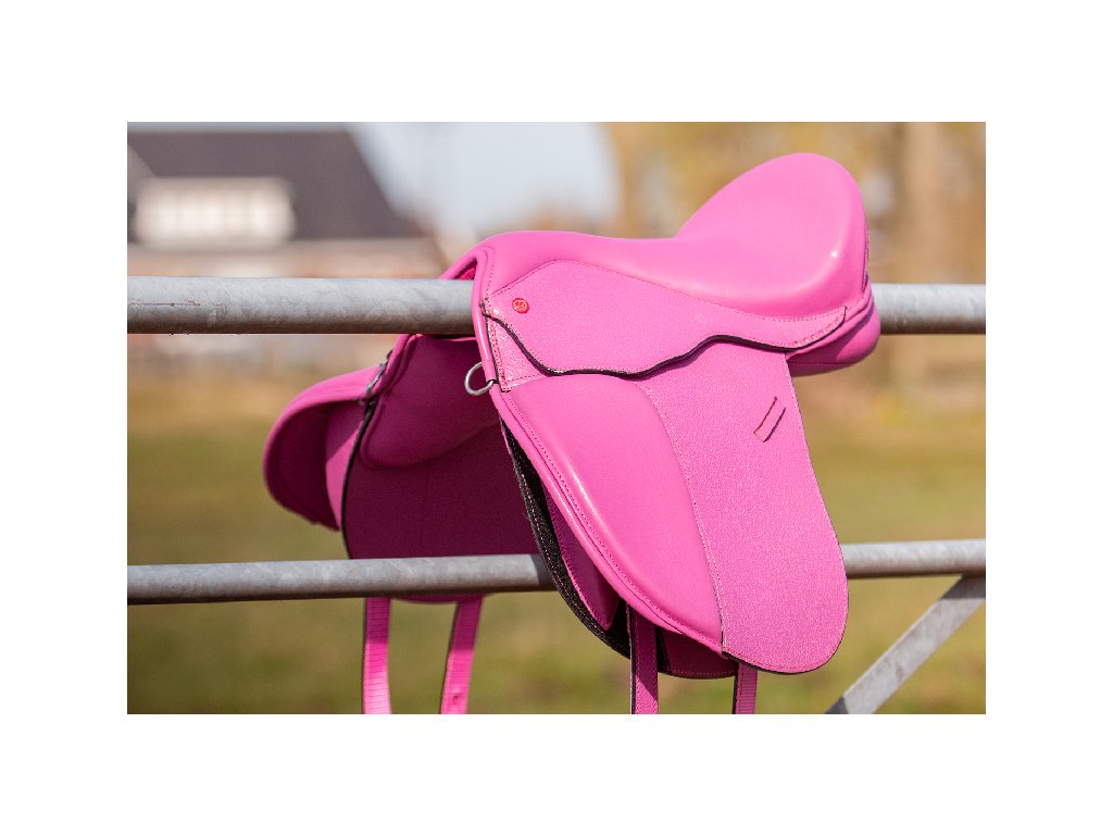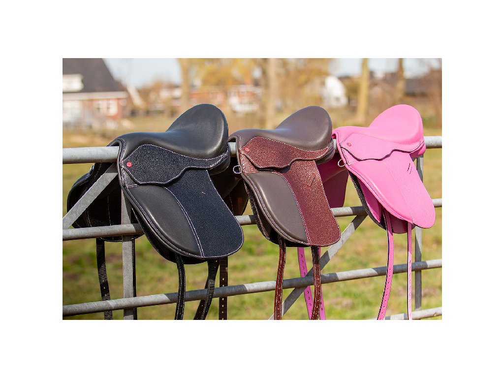 Díky použití výrazných druhů kůže a bílého ozdobného prošívání má sedlo rafinovaný, luxusní vzhled v černé i hnědé verzi. Pro mladé jezdce, kteří chtějí něco extra, je k dispozici také výrazná růžová varianta.