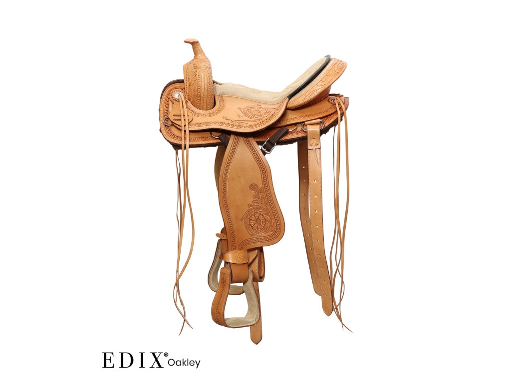 Sedlový twist sedla Oakley nabízí pohodlný, hluboký a bezpečný sed. Sedlo je polstrované pěnou a potažené kartáčovanou hovězí kůží. Šířku sedla lze nastavit výměnou vyměnitelné komory. Ve stejném stylu jako sedlo jsou k dispozici fendry Oakley a třmeny potažené kůží.