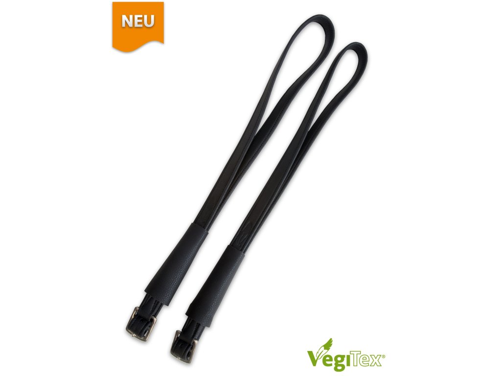 Veganské třmenové řemeny VegiTex® Special vyztužené nylonem proti deformaci. Řemeny se zapínají u spodní části třmenu, aby nedocházelo k tlaku na stehno. To zároveň umožňuje snadnější a bezpečnější nastavení délky třmenu přímo ze sedla, aniž by noha musela opustit bočnici. Použitím těchto třmenů se vyhnete otlakům spony na vašem sedle.