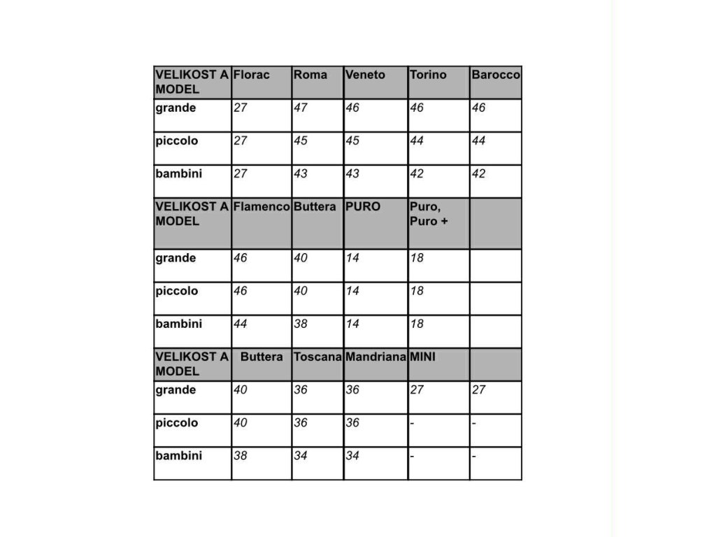 Velikosti: standard 18" (konfekční velikost 42 a více), picollo 17" (konfekční velikost do 40/42), bambini 16" (konfekční velikost do 36)